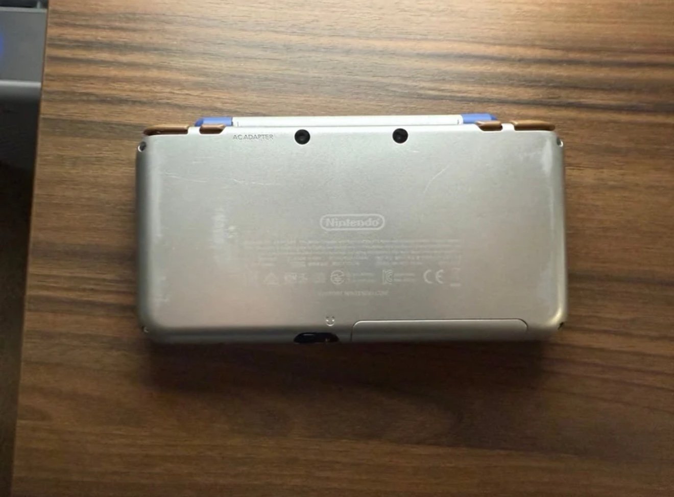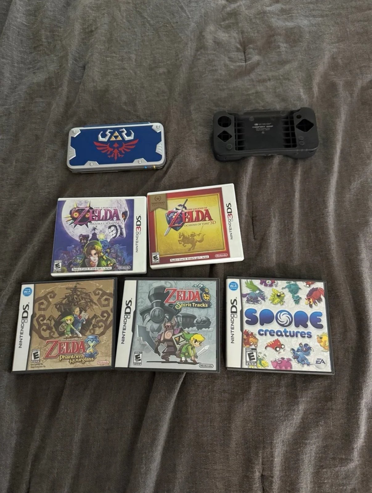 Includes the Hylian Shield edition of the New 2DS XL, no charger, a case and manual for soul silver, and the following games: