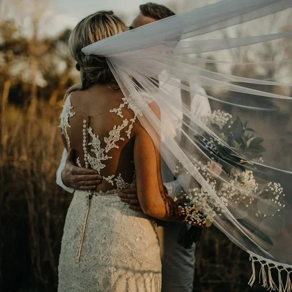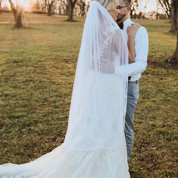 New from my handmade wedding shop!Our English net wedding veil is soft to the touch and flows smoothly. Boho fridge added to the bottom of the veil. Customize your bridal veil length at checkout!ABOUT THIS VEIL:Fingertip length 45 inches long Veil is sewn into a metal comb. English tulle available in white or ivory.Veil is 52 inches wide with a circled bottom.Fringe added to the bottom only. Other listings available with full fringe♥ Thanks for looking at my shop, Over the Moon BridalPHOTO CREDITS:Sarah Hansen Photography