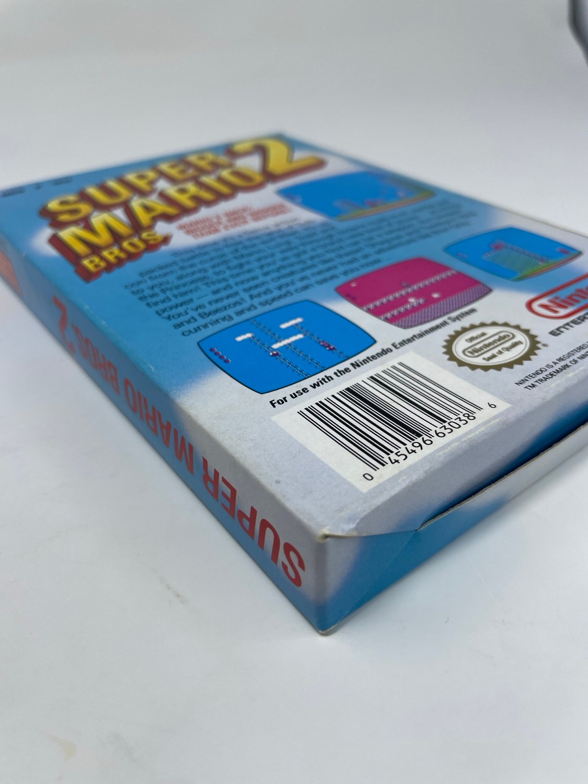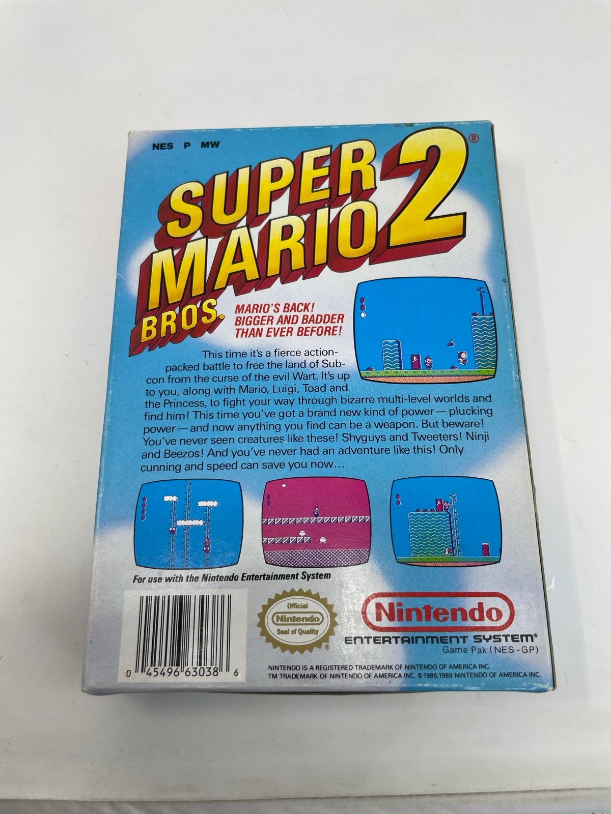 Super Mario Bros 2 for NES is fully complete in the box with the manual, extra insert, cartridge, foam all in plastic bag inside box with protectors case. It is fully tested, working and authentic. The cartridge is in very good condition with minimal light wear. The box is in really good condition with nice colors and no tears or rips in the box with light wear on edges and corners. (See photos for reference)